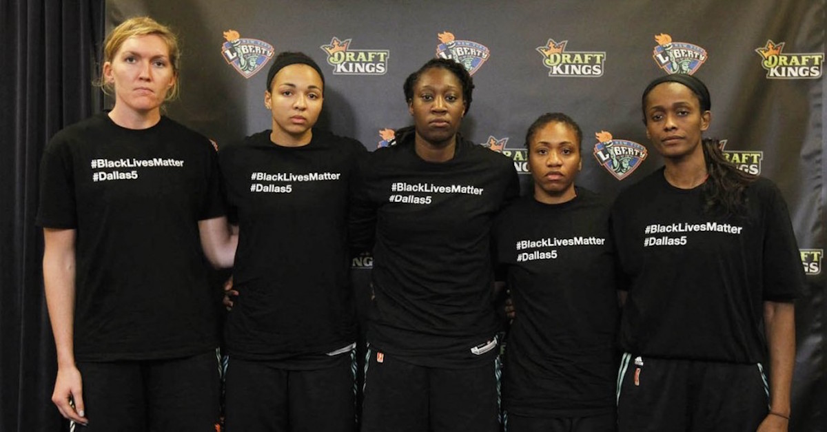 In the wake of the killings of Alton Sterling and Philando Castile by police and the shooting of five police officers in Dallas, WNBA teams wore warm-up T-shirts honoring the movement for Black lives and the slain officers. Players took the court wearing shirts that said phrases like “Change Begins With Us,” "Justice and Accountability," and "Black Lives Matter."